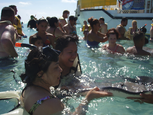Caption: Eileen and Marilyn petting the stingray