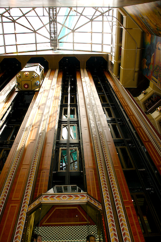 Caption: The open elevators to the main lobby